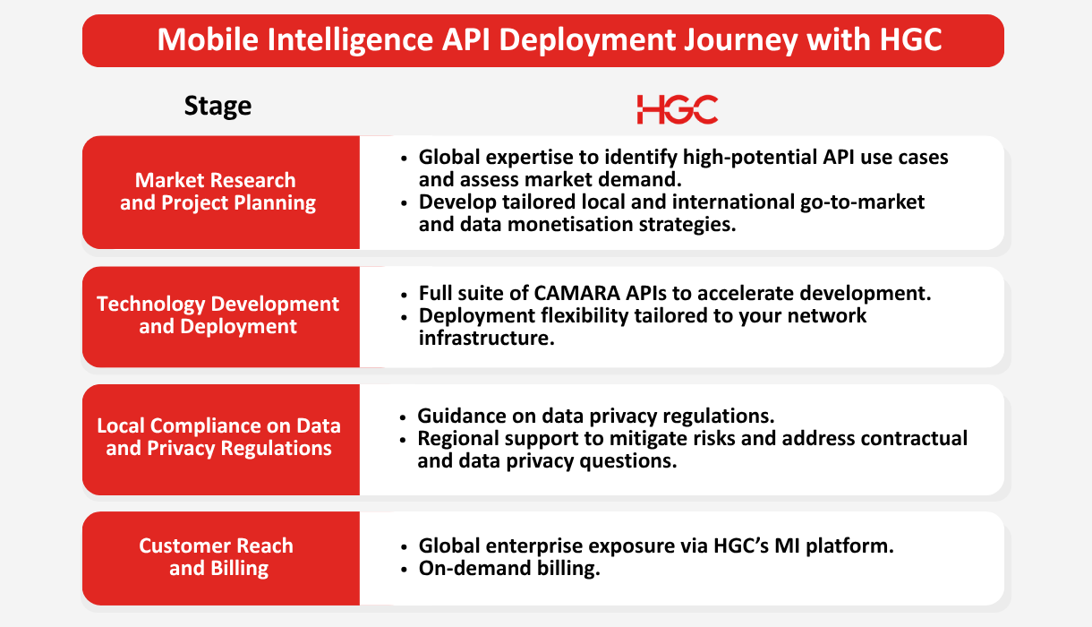 With deep insights into MNOs’ operational challenges and innovation needs, HGC offers more than just a Mobile Intelligence API Platform. Our team guides you through the full API journey — from initial engagement to live, revenue-generating transactions in as little as 4 months.