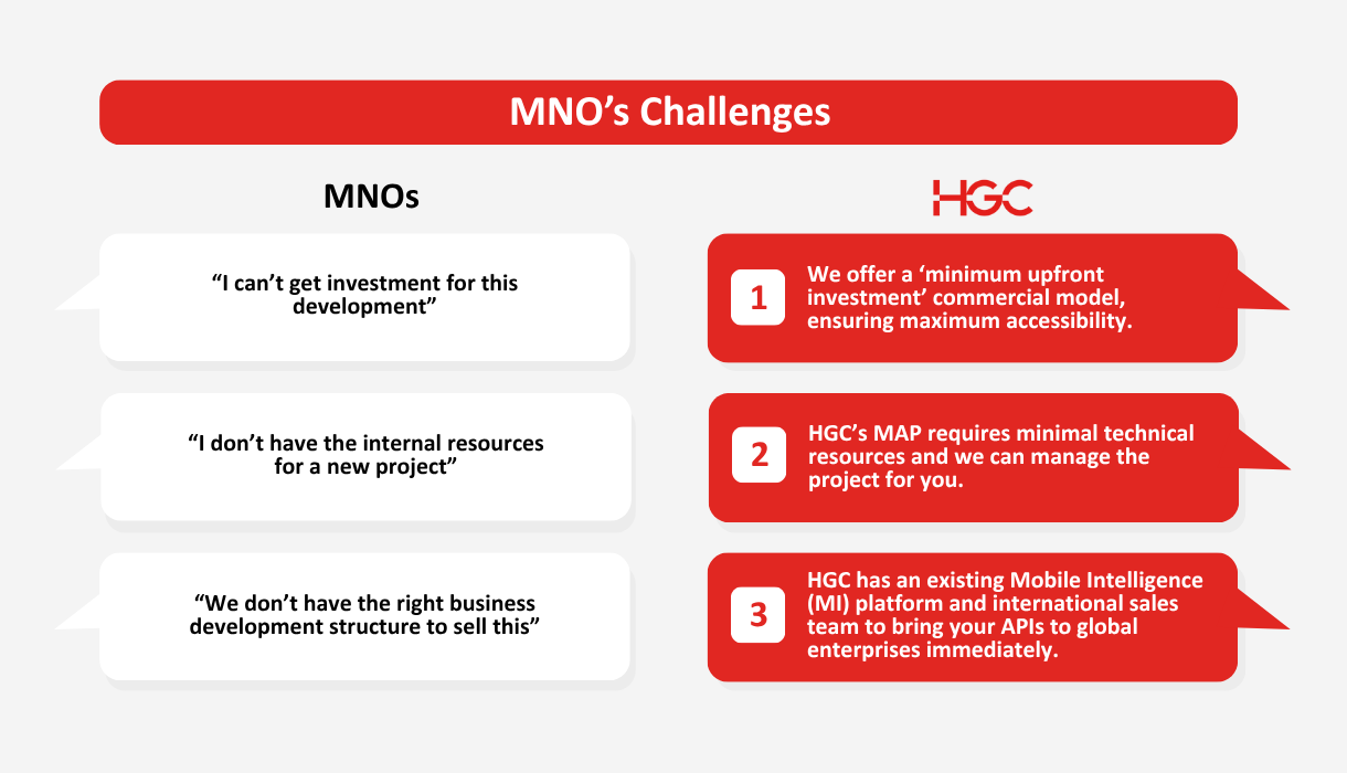 HGC's MAP enables MNOs to easily build and deploy over 30 standardized APIs, offering key benefits: